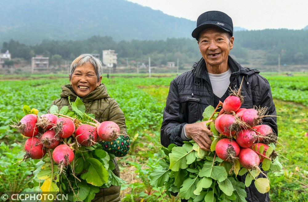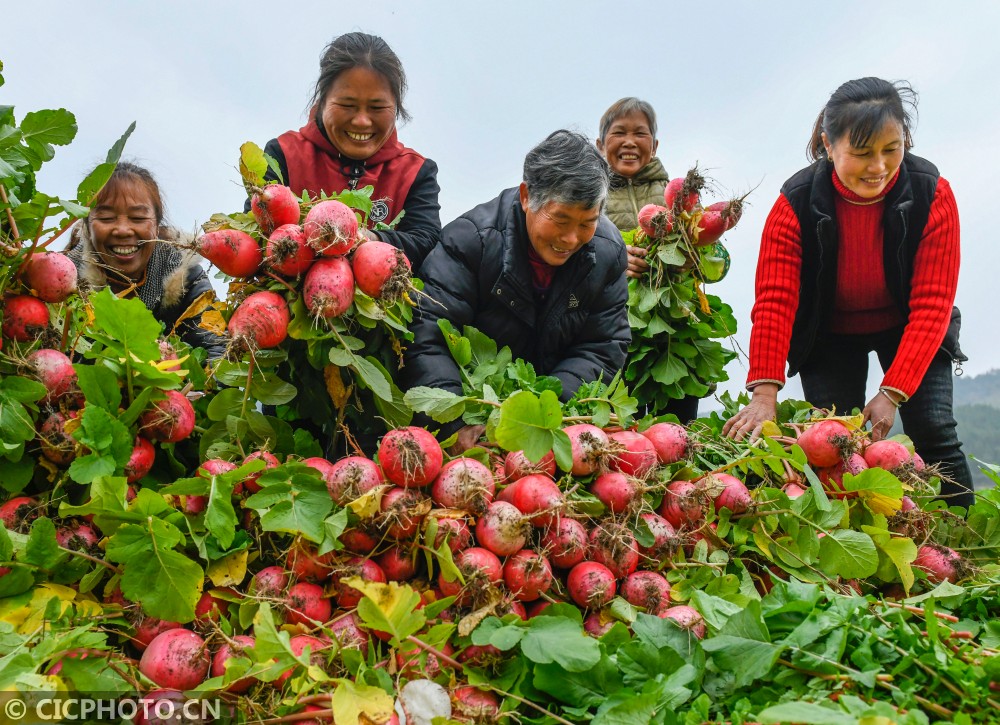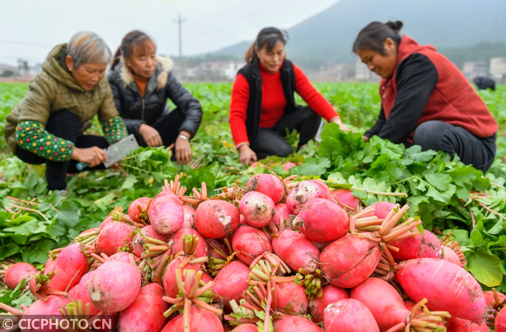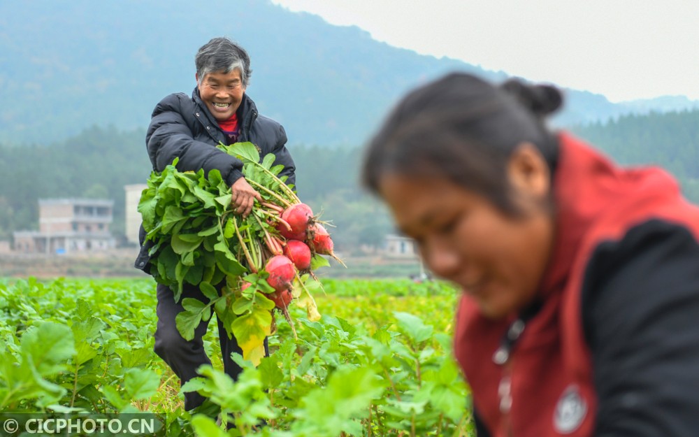 2020年12月9日,湖南省永州市道县柑子园镇善祥村,村民在采收“把截萝卜”。“把截萝卜”又称雪萝卜,皮红肉白,因其产于道县柑子园镇把截大洞而得名。近年来,湖南省永州市道县柑子园镇因地制宜,通过“党建+合作社+富民”新模式,大力发展“把截萝卜”种植,带动农民增收致富。目前,全镇发展“把截萝卜”种植2000余亩,与133户贫困户建立利益链接机制。