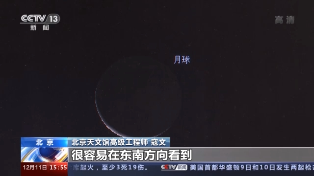 北京天文馆高级工程师 寇文:因为现在冬天嘛,天亮得比较晚,所以在六七点钟的时候,很容易在东南方向看到这两个明亮的天气,靠得非常近。在地球的某些地方,甚至能够看到月亮把金星遮挡住。但是在我们国家,只能看到这两个天体靠得非常近这么一个现象。