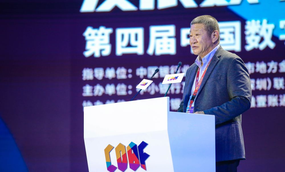 图为中小银行互联网金融(深圳)联盟理事长、平安集团监事会主席孙建一在第四届中国数字银行论坛上发言