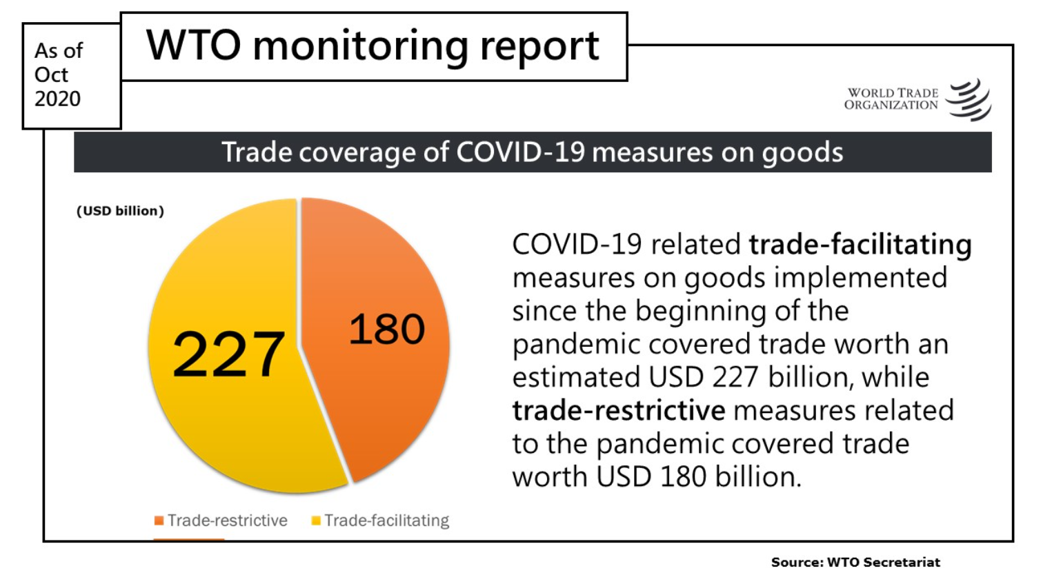 此外,与疫情直接相关的贸易措施显著影响了全球贸易。自疫情暴发以来,世贸组织成员实施的疫情相关贸易便利化措施涉及约2270亿美元的商品贸易,与疫情相关的贸易限制措施涉及约1800亿美元的贸易。335项疫情相关贸易措施中,58%具有贸易便利性,42%具有贸易限制性。到10月中旬,世贸组织成员针对疫情采取了1000多项支持措施,总价值达数万亿美元。