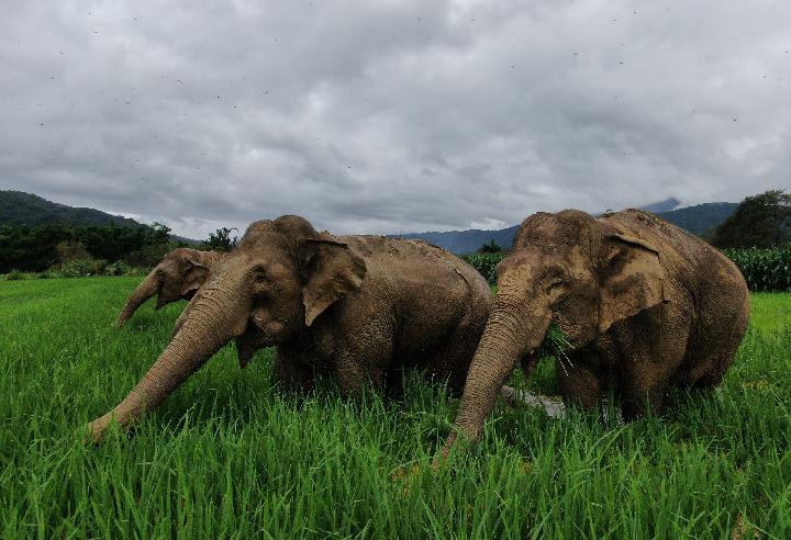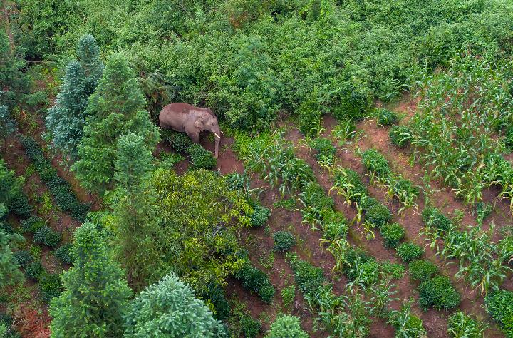 几头野生亚洲象在云南省西双版纳州破坏庄稼。(勐海亚洲象监测预警中心供图,2020年7月13日摄,无人机照片)
