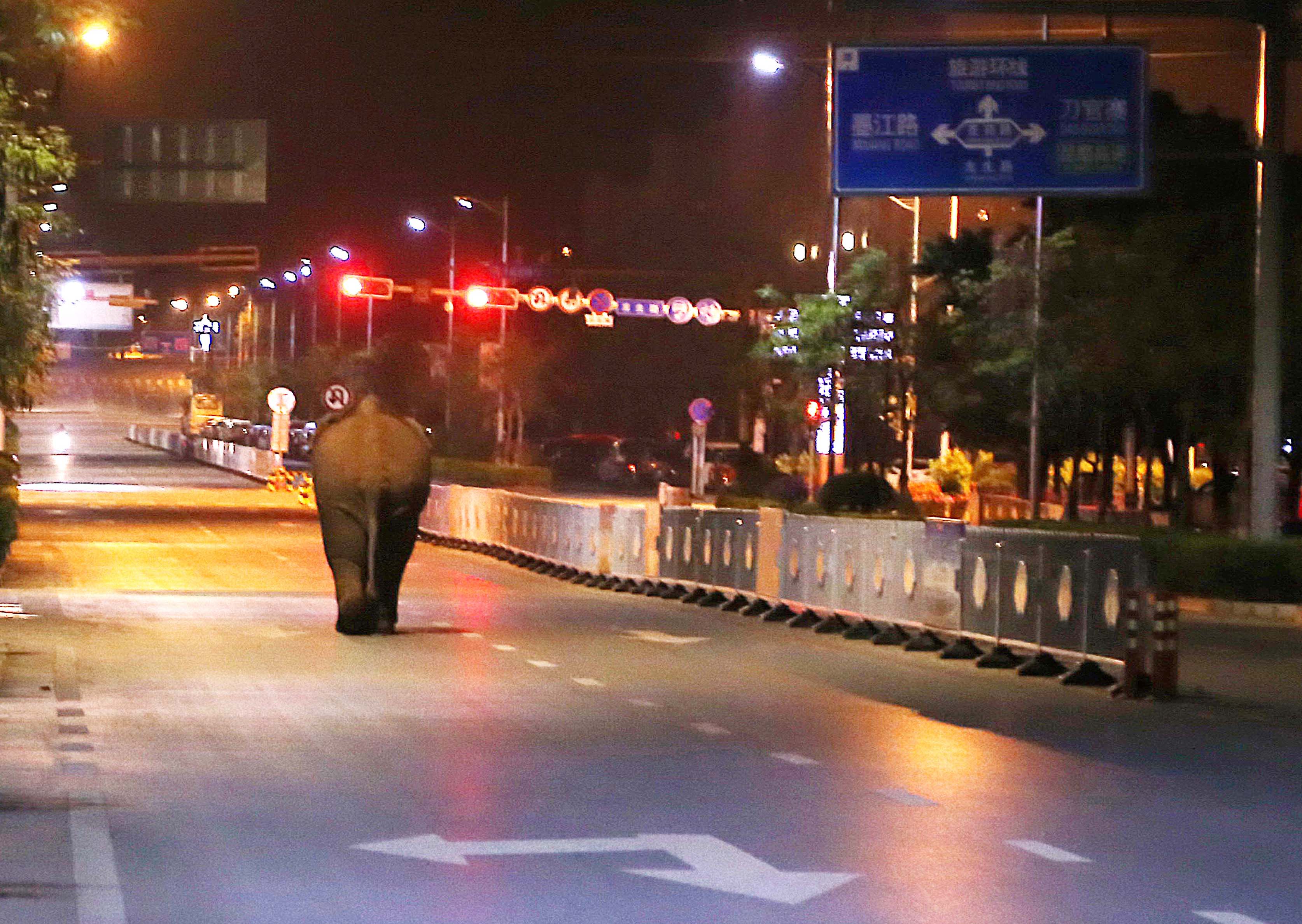 云南省普洱市的闹市区上演“象出没”,闯入城区的亚洲象在道路上逆行(2018年4月7日摄)。新华社发(吕禾摄)