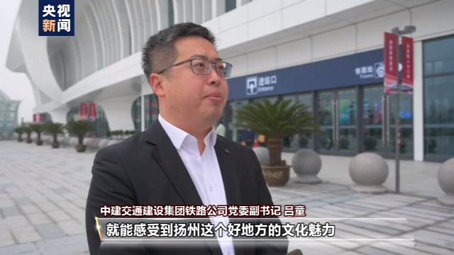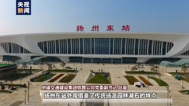 中建交通建设集团铁路公司党委副书记 吕童:扬州东站外观借鉴了传统扬派园林湖石特点,并在室内装修中融入扬州剪纸 琼花等文化符号,让广大旅客在旅途中 就能感受扬州这个好地方的文化魅力