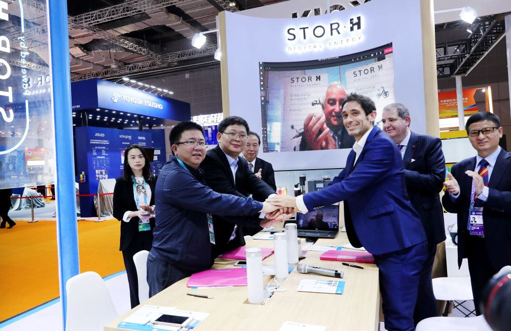 11月6日,在上海举行的第三届中国国际进口博览会上,中国和瑞士企业代表签订协议后握手互致祝贺。(新华社记者方喆摄)