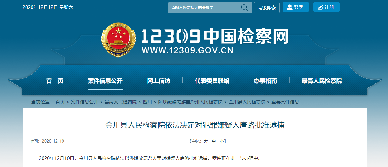 据中国检察网消息,2020年12月10日,金川县人民检察院依法以涉嫌故意杀人罪对嫌疑人唐路批准逮捕。案件正在进一步办理中。