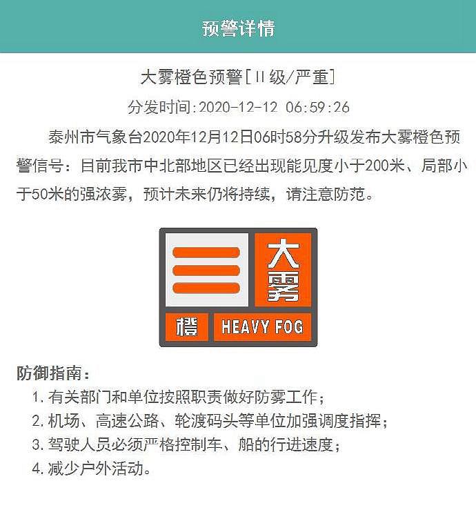 泰州市气象台12月12日6时58分升级发布大雾橙色预警信号:目前泰州市中北部地区已经出现能见度小于200米、局部小于50米的强浓雾,预计未来仍将持续,请注意防范。