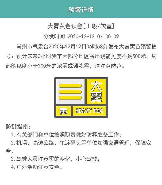 常州市气象台12月12日6时58分发布大雾黄色预警信号:预计未来3小时常州市大部分地区将出现能见度不足500米,局部能见度小于200米的浓雾或强浓雾,请注意防范。