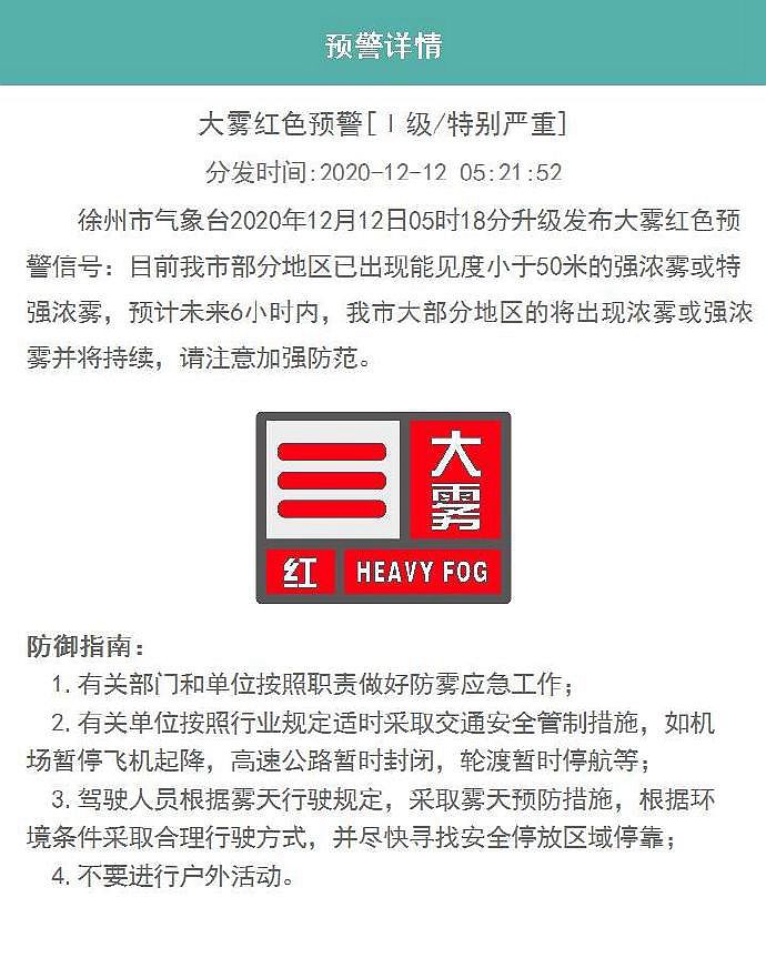 徐州市气象台12月12日5时18分升级发布大雾红色预警信号:目前徐州市部分地区已出现能见度小于50米的强浓雾或特强浓雾,预计未来6小时内,徐州市大部分地区的将出现浓雾或强浓雾并将持续,请注意加强防范。
