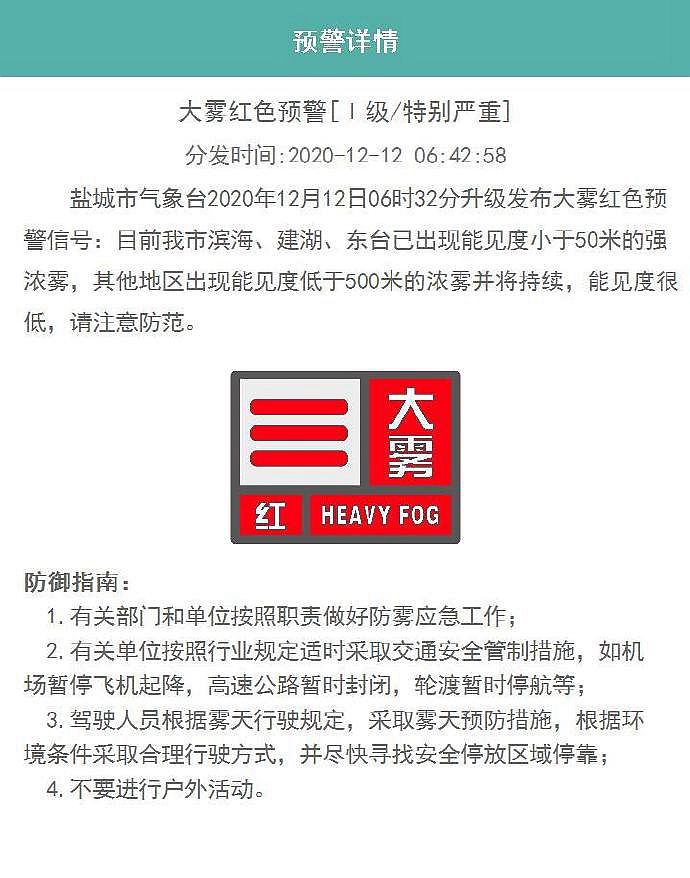 盐城市气象台2020年12月12日6时32分升级发布大雾红色预警信号:目前盐城市滨海、建湖、东台已出现能见度小于50米的强浓雾,其他地区出现能见度低于500米的浓雾并将持续,能见度很低,请注意防范。