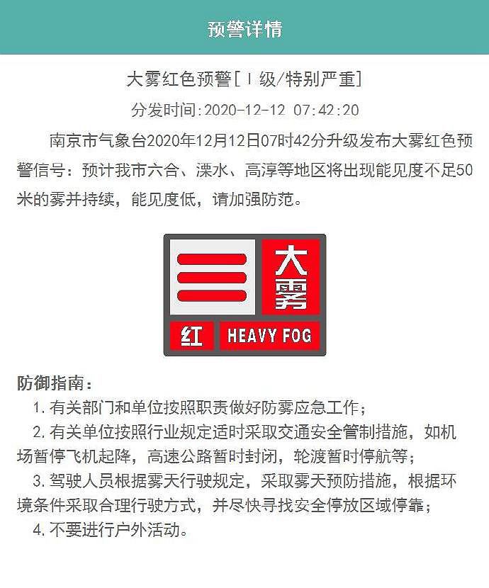南京市气象台12月12日7时42分升级发布大雾红色预警信号:预计南京市六合、溧水、高淳等地区将出现能见度不足50米的雾并持续,能见度低,请加强防范。