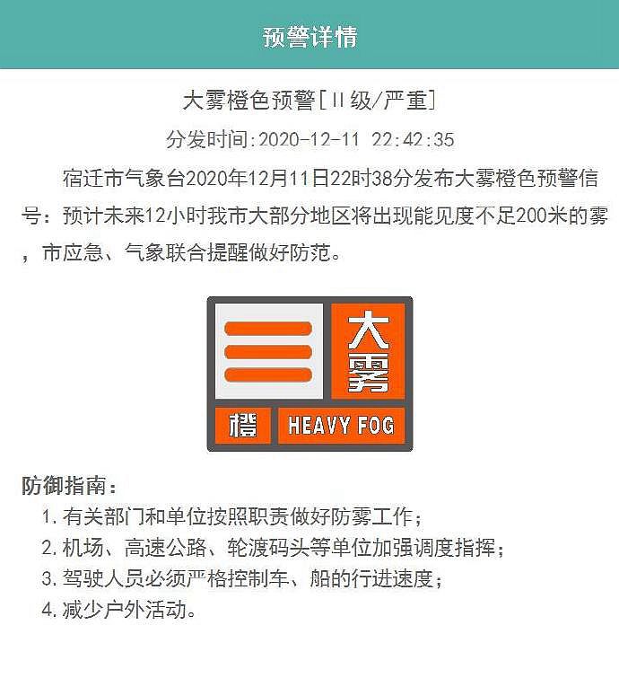 宿迁市气象台12月11日22时38分发布大雾橙色预警信号:预计未来12小时宿迁市大部分地区将出现能见度不足200米的雾,市应急、气象联合提醒做好防范。