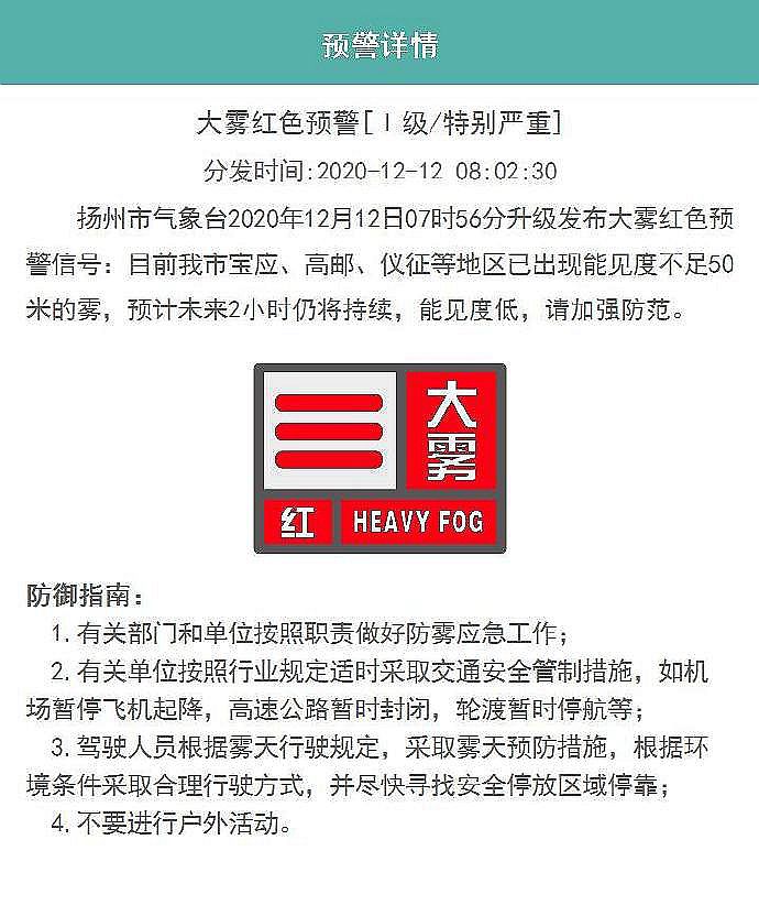 扬州市气象台12月12日7时56分升级发布大雾红色预警信号:目前扬州市宝应、高邮、仪征等地区已出现能见度不足50米的雾,预计未来2小时仍将持续,能见度低,请加强防范。