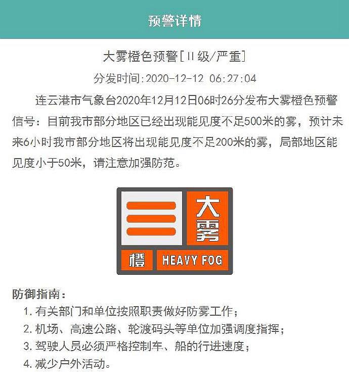 连云港市气象台12月12日6时26分发布大雾橙色预警信号:目前连云港市部分地区已经出现能见度不足500米的雾,预计未来6小时部分地区将出现能见度不足200米的雾,局部地区能见度小于50米,请注意加强防范。