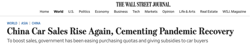 《华尔街日报》发文称,汽车销量的增加为中国经济复苏注入强劲动力,中国政府推出的放宽限购、提供资金补贴等举措也为汽车销量的增加起到了积极作用。