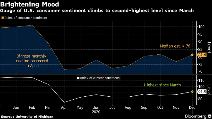 12月11日发布的数据显示,美国密歇根大学12月消费者信心指数初值升至81.4,比11月终值76.9上升4.5点,超出市场预期的76。尽管数据升至疫情暴发以来的第二高水平,但仍远低于疫情前100上下的水平,显示出距离消费者信心完全复苏,仍有很长的一段路要走。