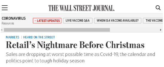 《华尔街日报》分析称,从目前的疫情形势来看,即将出炉的11月零售销售数据不容乐观,这使许多零售商的前景变得黯淡起来。更糟糕的是,那些在10月提前推出的假日促销活动,可能已经提前拉动了本应出现在11月和12月的消费需求,“透支”了部分购买力,令今年年底的消费季更加不容乐观。