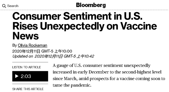 △彭博社报道,美国消费者信心受疫苗消息影响意外回升