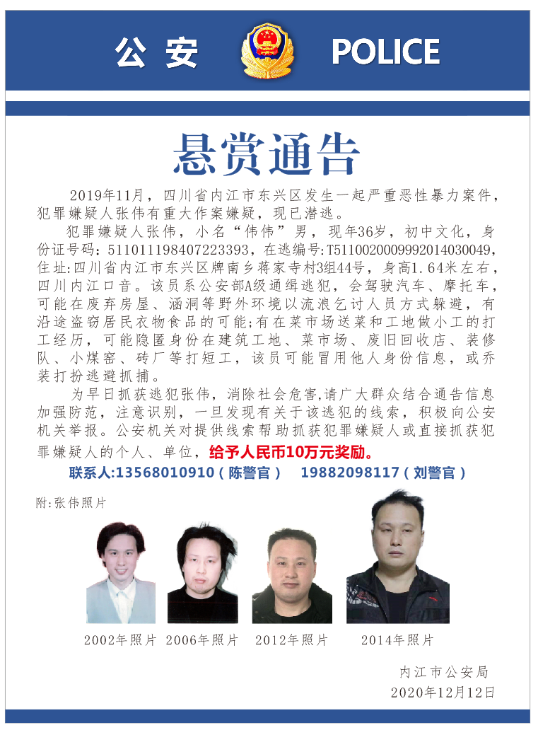 12月12日总台央视记者从四川内江公安局获悉,2014年3月20日和2019年11月7日,四川省内江市发生两起严重恶性暴力案件,造成3人死亡,犯罪嫌疑人张伟有重大作案嫌疑,现已潜逃。