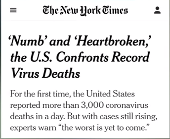 面对因新冠肺炎死亡人数再创达新高,纽约时报当地时间12月10日表示,美国新冠肺炎死亡人数屡破记录已让人从“心痛”到“麻木”,而最糟的时刻还没有到来。