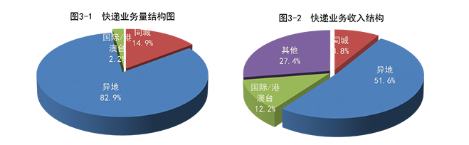 1至11月,同城、异地、国际/港澳台快递业务量分别占全部快递业务量的14.9%、82.9%和2.2%;业务收入分别占全部快递收入的8.8%、51.6%和12.2%。与去年同期相比,同城快递业务量的比重下降2.6个百分点,异地快递业务量的比重上升2.7个百分点,国际/港澳台业务量比重下降0.1。