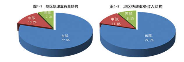 1至11月,东、中、西部地区快递业务量比重分别为79.5%、13.2%和7.3%,业务收入比重分别为79.7%、11.8%和8.5%。与去年同期相比,东部地区快递业务量比重下降0.2个百分点,快递业务收入比重下降0.6个百分点;中部地区快递业务量比重上升0.4个百分点,快递业务收入比重上升0.6个百分点;西部地区快递业务量比重下降0.2个百分点,快递业务收入比重基本持平。