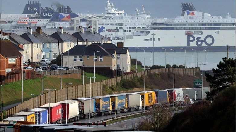 △多佛港口过境货车已排起长龙(图片来源:英国广播公司)