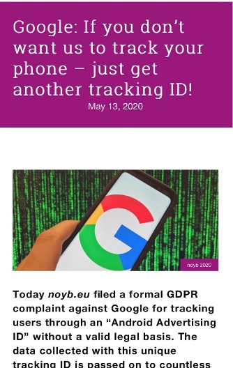 今年5月,根据NOYB官网披露的文件显示:每当消费者买了一部采用谷歌系统的手机,谷歌就会在手机上放置一个独特的追踪ID。就像一个“数字牌照”,追踪ID允许谷歌和无数第三方监视用户。