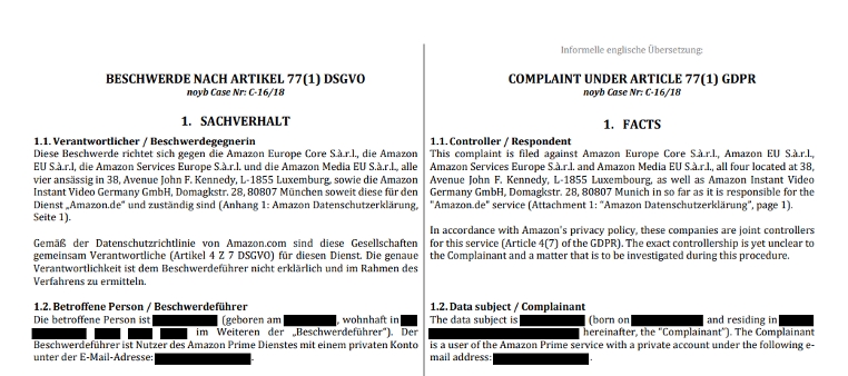 ▲图为NOYB组织递交的亚马逊和Youtube两家公司的投诉书