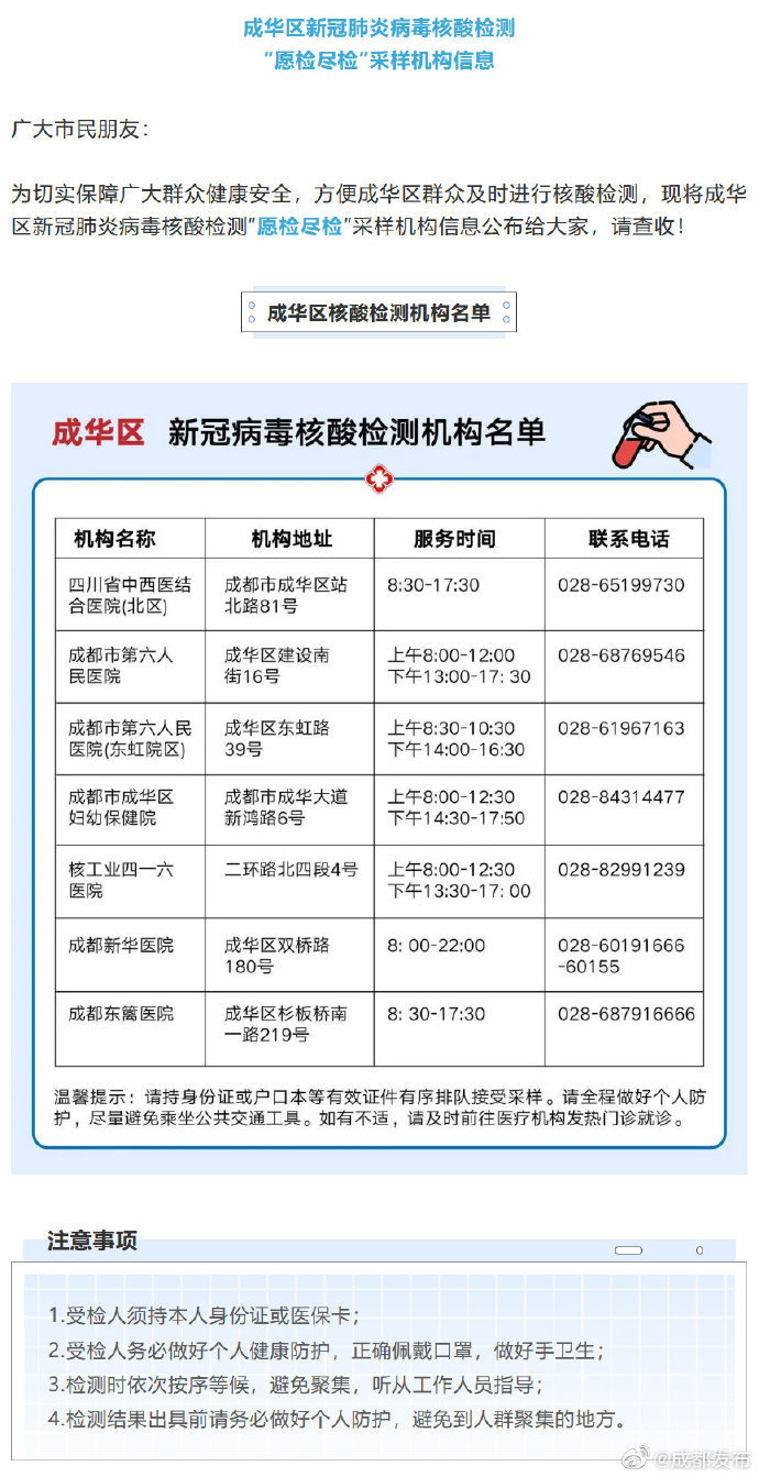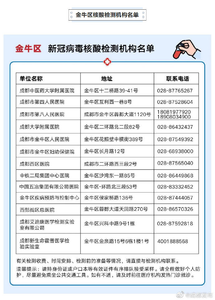 【成华、锦江、金牛核酸检测机构名单公布】