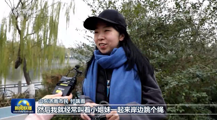 山东济南市民 付瑞雨:现在环境治理得这么好,我就经常叫着小姐妹来这里跳个绳,锻炼锻炼身体。