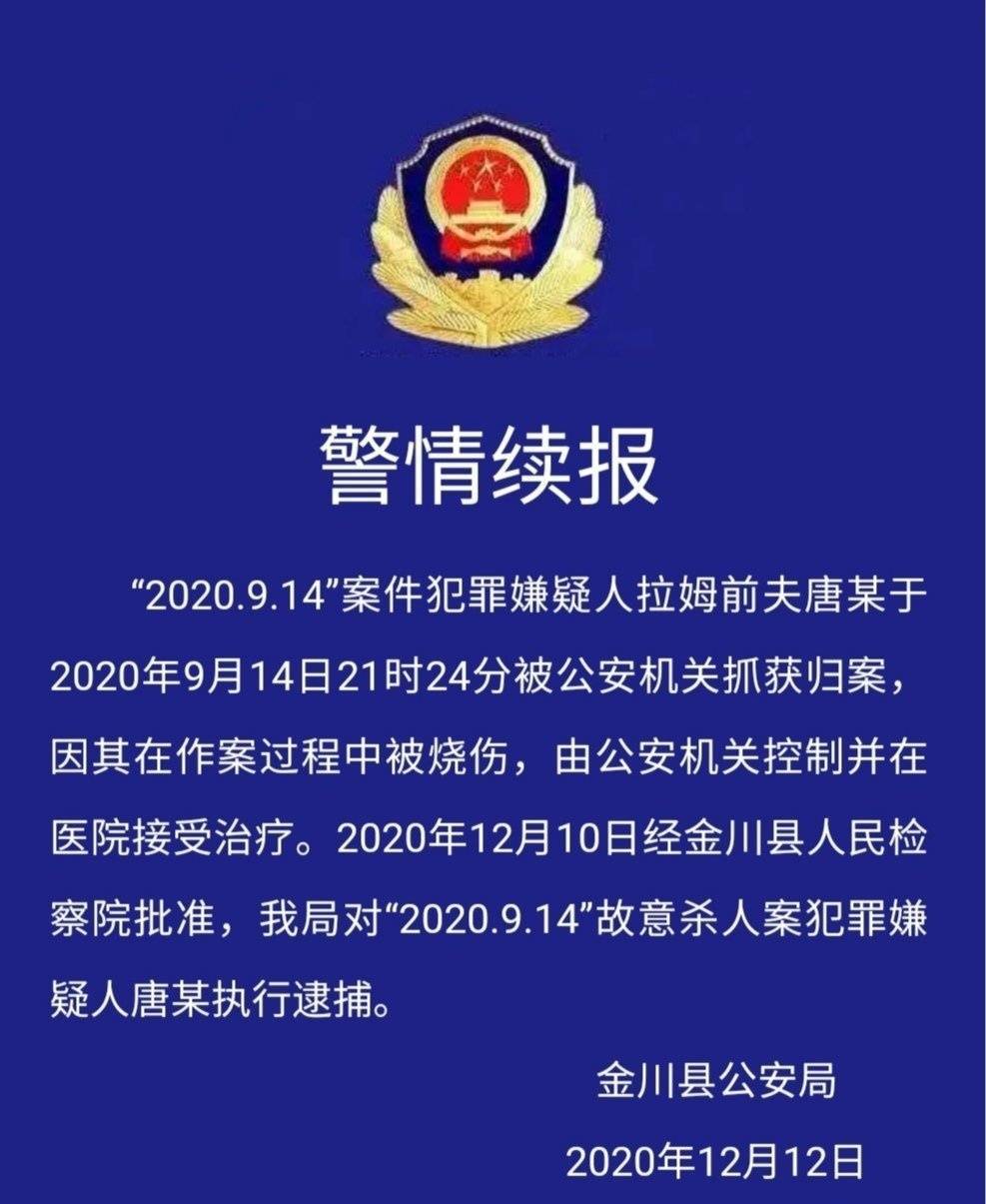 两天后的12月12日,金川县公安局发布警情续报称:“2020·9·14”案件犯罪嫌疑人拉姆前夫唐某,于2020年9月14日21时24分被公安机关抓获归案。因其在作案过程中被烧伤,由公安机关控制,并在医院接受治疗。2020年12月10日,经金川县人民检察院批准,金川县公安局对“2020·9·14”故意杀人案犯罪嫌疑人唐某执行逮捕。