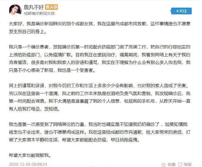 我不太清楚是谁暴露了我的个人信息,包括我的手机号,从昨天开始一直有人给我打电话、发短信。我只是不小心感染了新冠,我也是一个受害者。网上的谩骂和诽谤,对我今后的工作和生活上多多少少会有影响,也对我的家人造成了伤害。