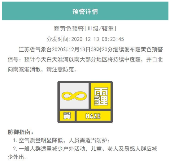江苏省气象台2020年12月13日08时20分继续发布霾黄色预警信号:预计今天白天淮河以南大部分地区将持续中度霾,并自北向南逐渐消散,请注意防范。