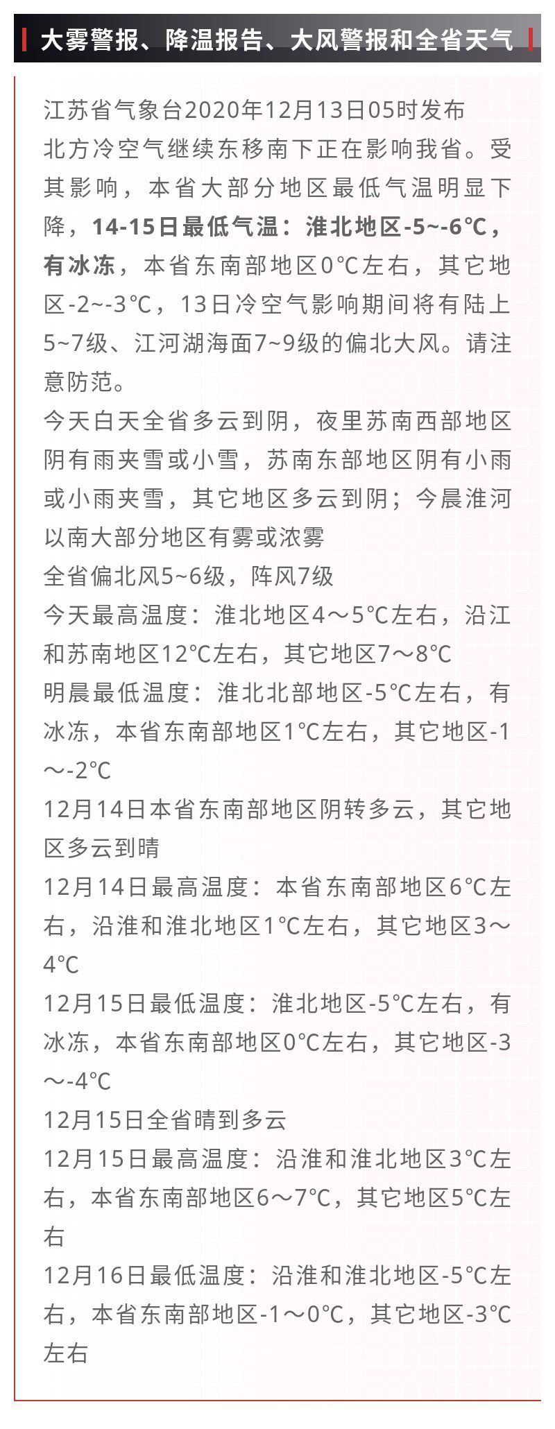据江苏省气象台2020年12月13日05时发布北方冷空气继续东移南下正在影响江苏。受其影响,本省大部分地区最低气温明显下降,14-15日最低气温:淮北地区-5~-6℃,有冰冻,本省东南部地区0℃左右,其它地区-2~-3℃,13日冷空气影响期间将有陆上5~7级、江河湖海面7~9级的偏北大风。请注意防范。今天白天全省多云到阴,夜里苏南西部地区阴有雨夹雪或小雪,苏南东部地区阴有小雨或小雨夹雪,其它地区多云到阴;今晨淮河以南大部分地区有雾或浓雾。