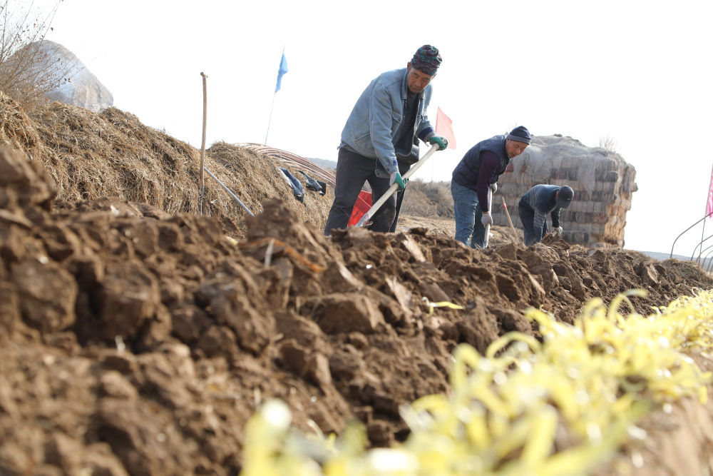 ↑12月12日,张家大坪村村民在除去麦草“棉被”与韭黄之间的杂草。