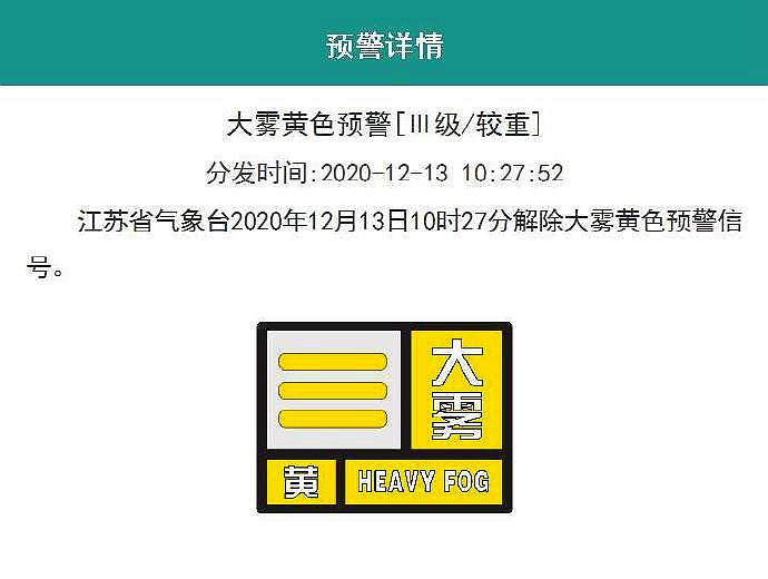 江苏省气象台2020年12月13日10时27分解除大雾黄色预警信号。