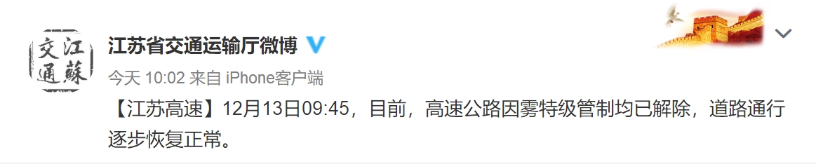 据江苏省交通综合执法局,12月13日9时45分,目前高速公路因雾特级管制均已解除,道路通行逐步恢复正常。