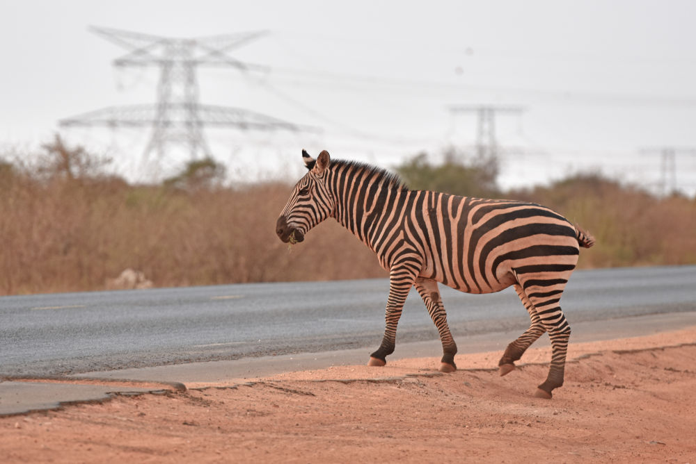 图为2017年2月22日,在肯尼亚察沃国家公园附近,一只斑马穿过蒙内铁路野生动物通道后试图穿越公路。(新华社记者孙瑞博摄)