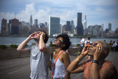 2017年8月21日,人们在美国纽约观看日全食。当地时间8月21日,一次罕见的日全食景观横贯美国大陆。