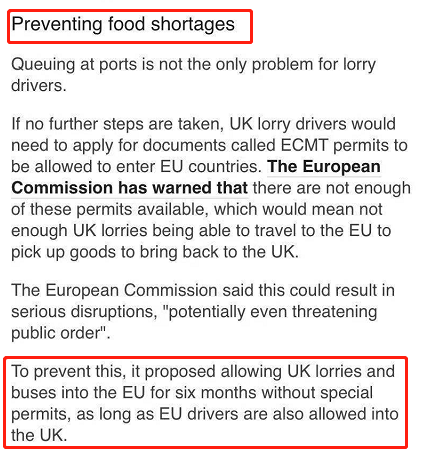 为避免英国出现货物短缺的情况,欧盟还提出了一个过渡方案,该方案称,未来6个月,英欧双方的载重卡车和货车在进出对方国家时无须提供特殊许可证;英欧间“特定航空服务”也将继续,最长可执行6个月,但前提是英国能够提供对等的政策。