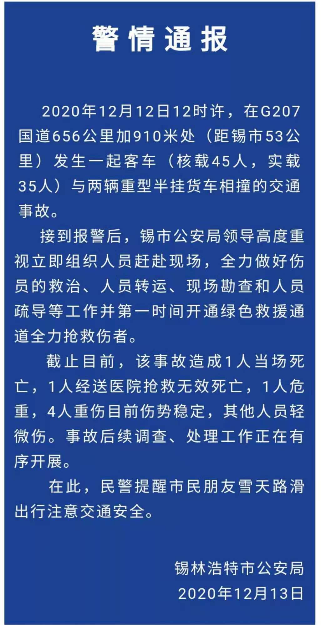 2020年12月12日12时许,在G207国道656公里加910米处(距锡市53公里)发生一起客车(核载45人,实载35人)与两辆重型半挂货车相撞的交通事故。