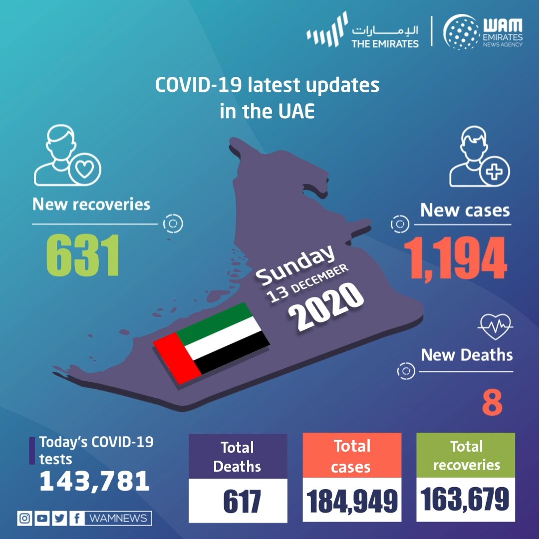 当地时间12月13日,阿联酋卫生和预防部通报阿联酋新增1194例新冠肺炎确诊病例,同时新增631例治愈病例,新增8例死亡病例。至此阿联酋境内新冠肺炎确诊病例累计达184949例,其中治愈病例163679例,死亡病例617例。