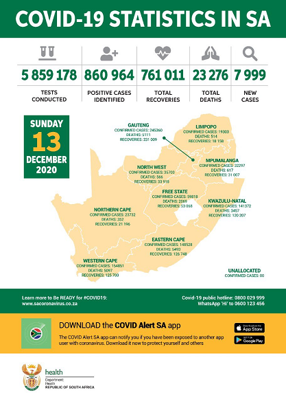 12月13日南非卫生部确认南非当天新增新冠肺炎患者7999人,新冠肺炎患者总人数达到860964人,南非全国已检测5859178人,当日检测39423人。