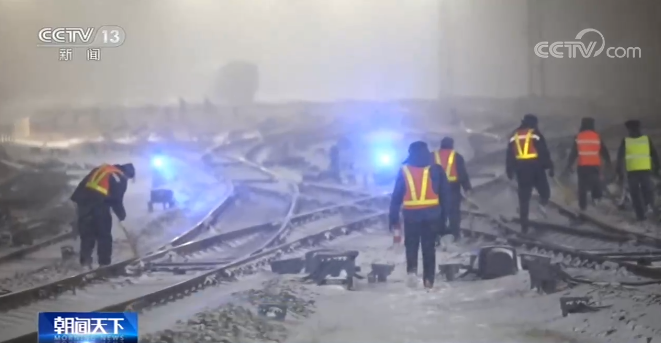 13日凌晨2时20分, 79名身着黄色马甲的一线职工驻守在242组道岔旁,对重点部位道岔实行检查和除雪。山海关站两端咽喉区事关京哈、沈山、津山、龙山干线的通畅,车务、工务、电务等单位组织职工对重点处所死盯死守,不间断地清扫积雪,确保行车设备正常工作。到凌晨2时50分,路面地面积雪已达7厘米,但车站道岔始终保持无积冰积雪,保障了铁路大动脉的安全畅通。