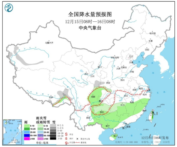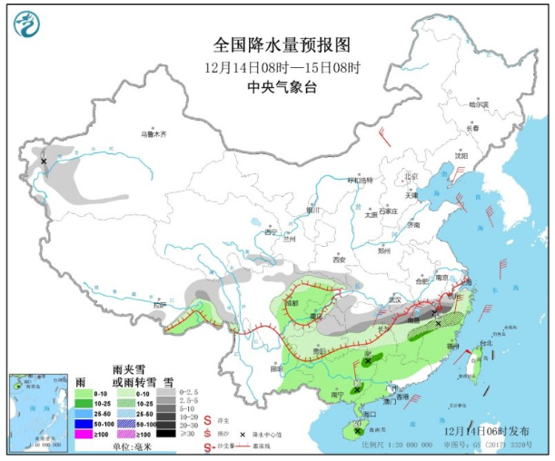 今天,雨雪强度将有所减弱,范围向南收缩。中央气象台预计,江南大部、西南地区东南部、川西高原北部、新疆南疆西部以及西藏东部等地部分地区有小到中雪或雨夹雪,局地大雪(5~9毫米)。江南南部、四川盆地、云南东部、华南大部等地部分地区有小雨,局地中雨(10~20毫米)。