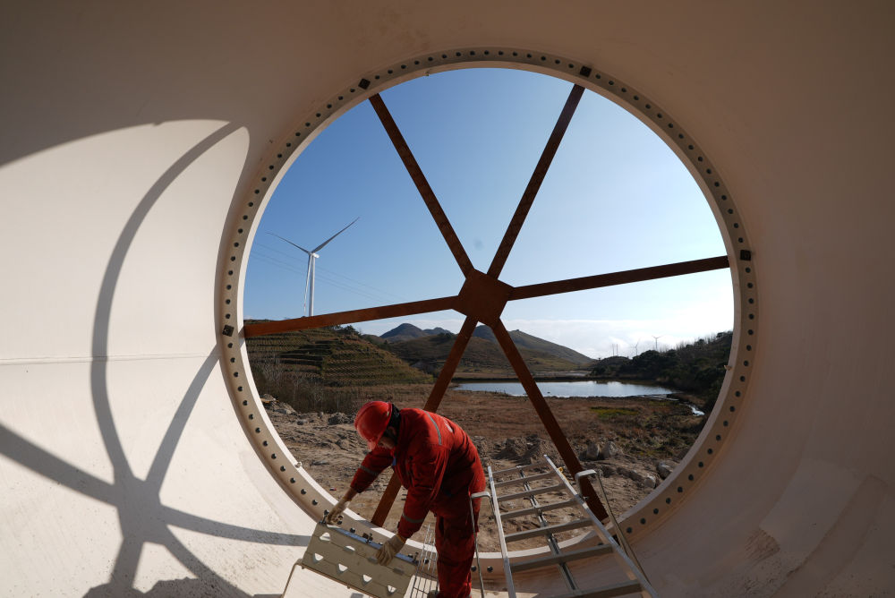 12月10日,在广西龙胜各族自治县平等镇南山风电项目建设工地,施工人员在安装风力发电设备。新华社发(黄勇丹 摄)