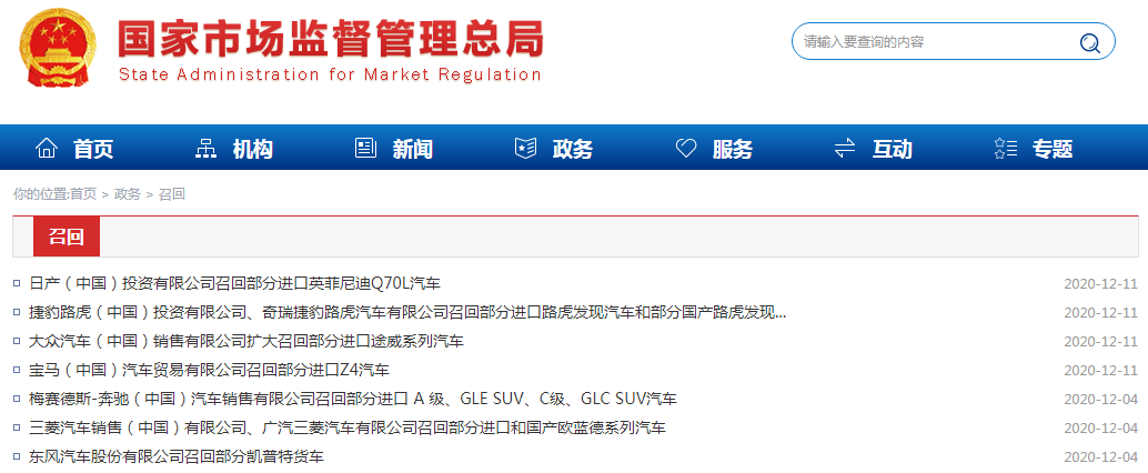 日前,国家市场监督管理总局网站公布了一批车辆召回信息。