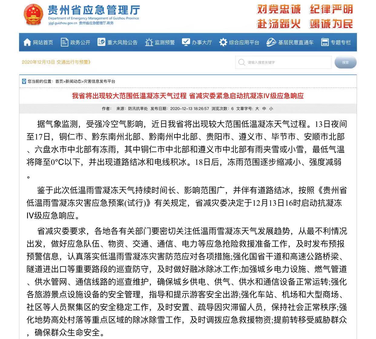 鉴于此次低温雨雪凝冻天气持续时间长、影响范围广,并伴有道路结冰,按照《贵州省低温雨雪凝冻灾害应急预案(试行)》有关规定,贵州省减灾委决定于12月13日16时启动抗凝冻Ⅳ级应急响应。