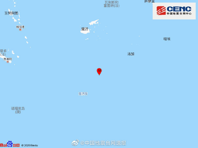 斐济群岛以南海域发生5.8级地震 震源深度550千米