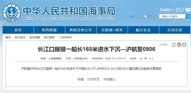 据上海海事局官方网站消息,长江口一船长165米进水下沉,16人遇险,请过往船舶注意搜救。